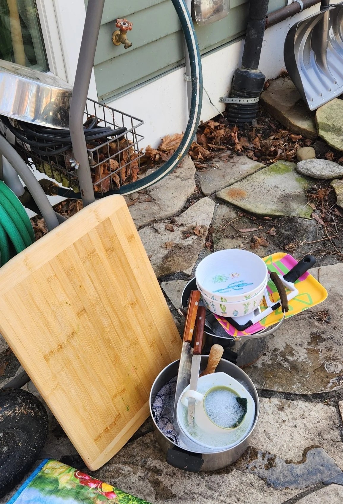 This is what doing dishes without a kitchen sink looks like.