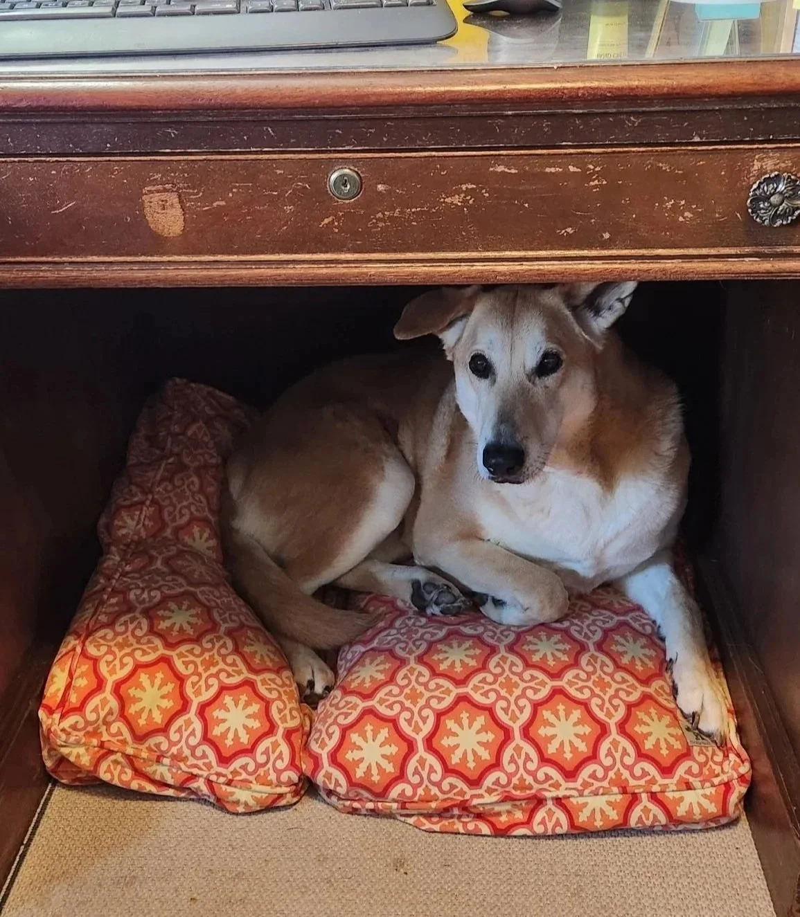 I have two dog beds in my office. This is Sadie’s favorite, right under my desk.